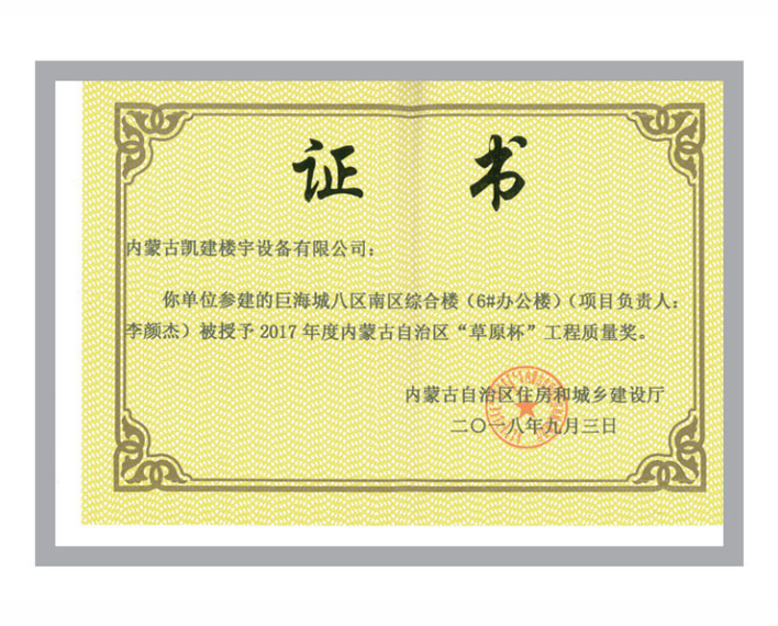 巨海城八区南区综合楼(6#办公楼)获2017年度内蒙古自治区“草原杯”工程质量奖2018